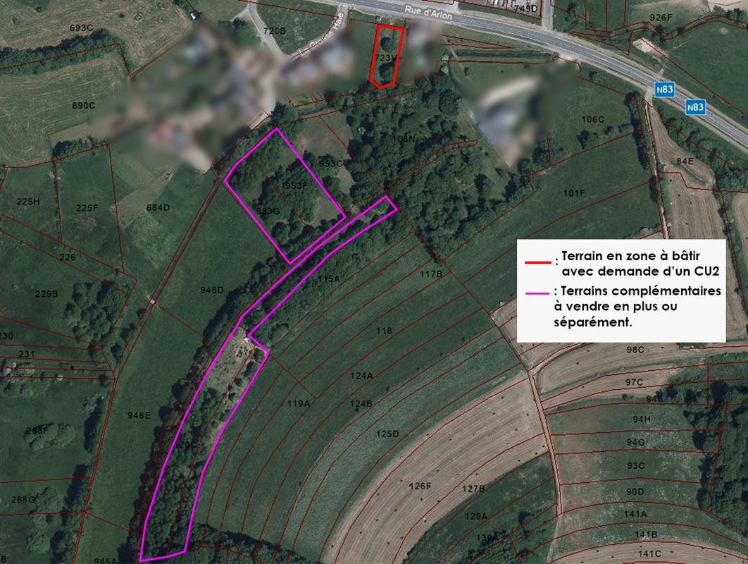 Dans le joli hameau de Frenois (commune de Chiny) venez découvrir ce terrain plat de 11a96ca en partie en zone à bâtir. Réf parcelle 0723VP0000 rue de la Grosse Haie. Représenté par les 2 premières photos. Orientation du jardin et de la terrasse: Sud La vente pourra s'effectuer en mentionnant une clause suspensive pour l'obtention d'un CU2. De plus, vous avez la possibilité d'acquérir jusqu'à 5 parcelles complémentaires en zone bois et terre VV pour une superficie totale de 1 ha 60 a et 80 ca. Références: 0120CP0000; 0121P0000; 0113P0000; 0953GP0000; 0953FP0000 La parcelle complémentaire la plus proche est située à environ 150 mètres du terrain en zone à bâtir. Le prix affiché est uniquement le prix de la parcelle 0723VP0000. Les surfaces et mesures affichées ne sont données qu'à titre indicatif. Les plans, informations et idées de modifications fournis et réalisés par l’agence Villas ont un caractère indicatif et non contractuel. Toute modification doit recevoir l’accord des autorités compétentes. Les propriétaires se réservent souverainement le droit d’apprécier la hauteur et la qualité des offres. L’agent immobilier n’a pas le pouvoir de vendre. Les propriétaires fixent le montant des offres minimum à prendre en considération. Le refus de l’offre par le propriétaire n’ouvre, au profit de l’offrant, aucun droit à une quelconque indemnité. Le propriétaire, vendeur du bien, dispose de la faculté, de manière totalement libre et autonome, de vendre ou de ne pas vendre. S’il décide de vendre, il n’est nullement tenu de retenir l’offre la plus élevée mais choisit celle qui lui convient le mieux au regard de ses propres critères (montant de l’offre, conditions suspensives, délai de signature, etc.) Il est recommandé aux acquéreurs de prendre des informations complémentaires au besoin auprès des institutions, des architectes, des entrepreneurs,...